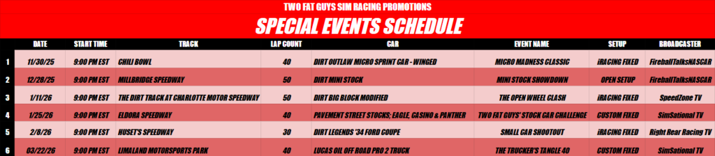 The Micro Madness Classic will mark the return of Two Fat Guys Sim Racing Promotions’ Special Events- this time in a championship format! The series will have 6 events, with the first occurring later tonight at The Chili Bowl with The Micro Madness Classic. All events are free to enter, winners will receive a Feature Winner Sticker in the mail, and the champion of the series will receive a custom 3d printed lightbox trophy.